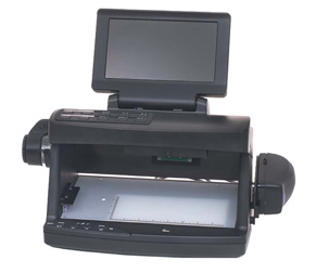 Le document est introduit à l'intérieur du boîtier, et l'examen peut se faire soit de façon globale, soit dans le détail à l'aide d'une loupe.